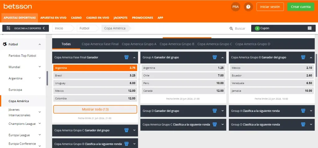 3. Betsson: Sponsor oficial de Boca y de Racing, el gigante sueco hace honor a su apodo con 60 años de trayectoria. Está disponible en CABA, Provincia de Buenos Aires y es actualmente la única casa que permite crear una apuesta para la Copa América desde la provincia de Córdoba.