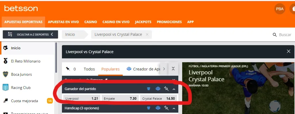 Veamos el partido de Liverpool vs Crystal Palace del 14 de abril, donde el favorito es el Liverpool. Las cuotas a ganador del partido (extraídas el 13/04/24 a las 18hs) son: