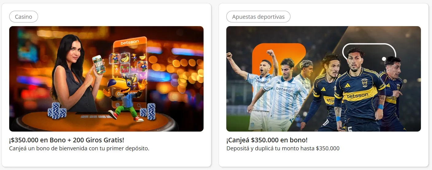 El otro bono de bienvenida Betsson, y este sí nos interesa, le brinda al nuevo usuario la posibilidad de duplicar su primer ingreso hasta $350.000 para utilizarlo en la sección de apuestas deportivas.