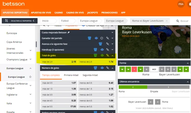 Veamos un ejemplo en Betsson de un partido de la Liga Europea, para entender las apuestas más menos: