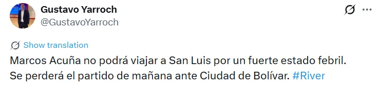 Según informó el periodista Gustavo Yarroch, se trata de Marcos Acuña. El Huevo, que viene de formar parte del once inicial ante Argentinos Juniors, se quedará fuera de la lista de convocados a raíz de un fuerte estado febril.
