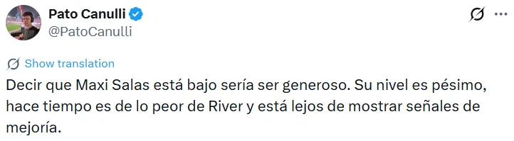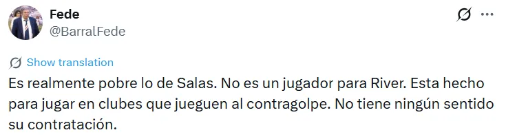 Tras el partido, algunos hinchas se volcaron a las redes sociales para manifestar su descontento con el ex Racing, quien atraviesa por su séptimo mes en el Millonario luego de ser fichado desde La Academia a cambio de ocho millones de euros.