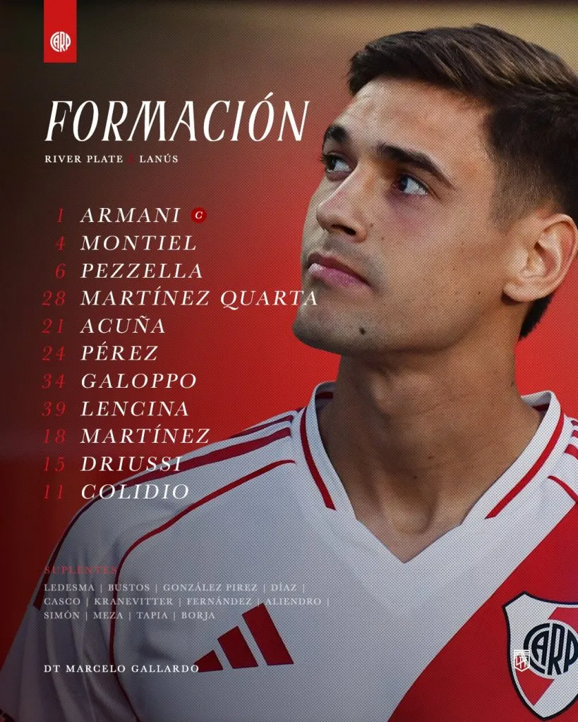 Franco Armani; Gonzalo Montiel, Germán Pezzella, Lucas Martínez Quarta, Marcos Acuña; Enzo Pérez, Santiago Lencina, Giuliano Galoppo; Gonzalo Martínez, Sebastián Driussi y Facundo Colidio, los once elegidos por el Muñeco para enfrentar al Granate.