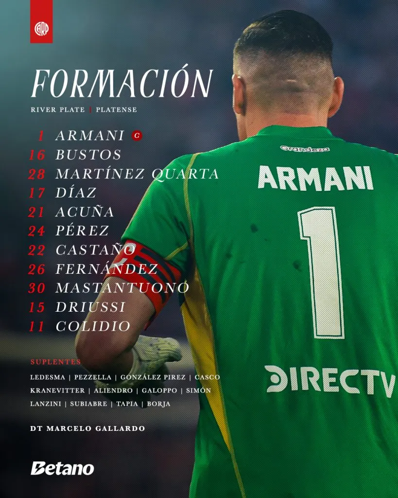 Franco Armani; Fabricio Bustos, Lucas Martínez Quarta, Paulo Díaz, Marcos Acuña; Enzo Pérez, Kevin Castaño, Ignacio Fernández, Franco Mastantuono; Facundo Colidio y Sebastián Driussi, los once elegidos por Marcelo Gallardo para enfrentar a Platense.