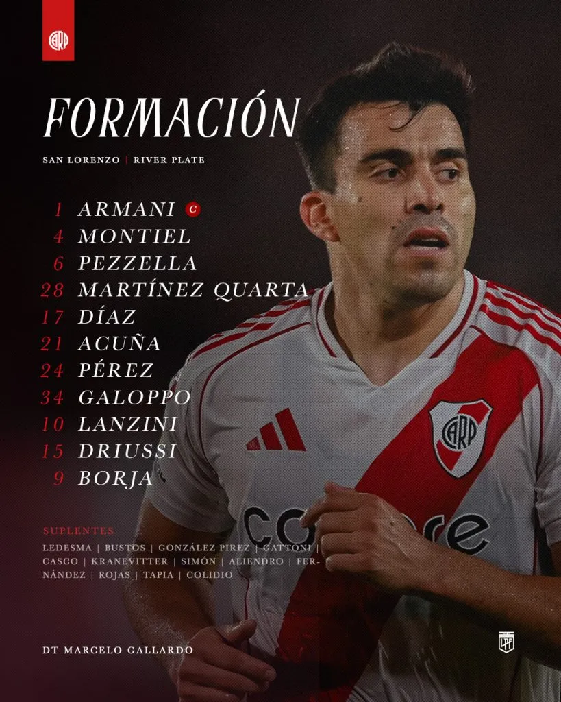 Franco Armani; Gonzalo Montiel, Paulo Díaz, Germán Pezzella, Lucas Martínez Quarta, Marcos Acuña; Enzo Pérez, Giuliano Galoppo, Manuel Lanzini; Sebastián Driussi y Miguel Borja, los once elegidos por el Míster para enfrentar al Ciclón.