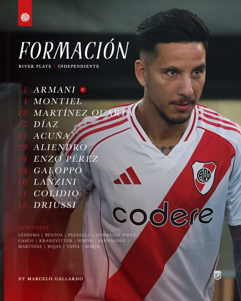 Franco Armani; Gonzalo Montiel, Lucas Martínez Quarta, Paulo Díaz, Marcos Acuña; Enzo Pérez, Giuliano Galoppo, Rodrigo Aliendro, Manuel Lanzini; Facundo Colidio y Sebastián Driussi, el equipo elegido por Marcelo Gallardo para esta noche.