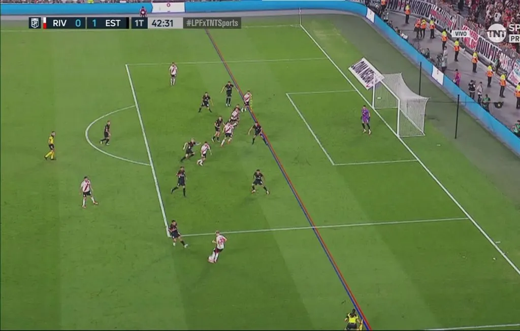 Tras un centro de Mastantuono, Paulo apareció solo por el segundo palo y empujó la pelota. Inmediatamente, la asistente levantó la bandera, señalando fuera de juego del central. Pese a ser cuestión de milímetros, el VAR le dio la razón a la jueza de línea, anulando así el tanto del Millonario.
