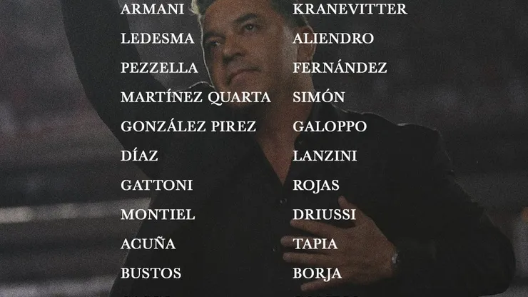 Así sale el equipo del Muñeco para enfrentar a San Lorenzo: Franco Armani; Gonzalo Montiel, Germán Pezzella, Lucas Martínez Quarta, Paulo Díaz, Marcos Acuña; Giuliano Galoppo, Enzo Pérez, Manuel Lanzini; Sebastián Driussi y Miguel Borja.