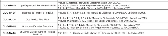 Así lo informó el máximo ente sudamericano en su web oficial, donde detallaron los clubes que serán investigados. Son varios, tanto en Libertadores como en Copa Sudamericana. River tiene iniciado un expediente por cinco posibles incumplimientos, tres de ellos del Manual de Clubes y dos del Código Disciplinario, englobados en el expediente 172-25.