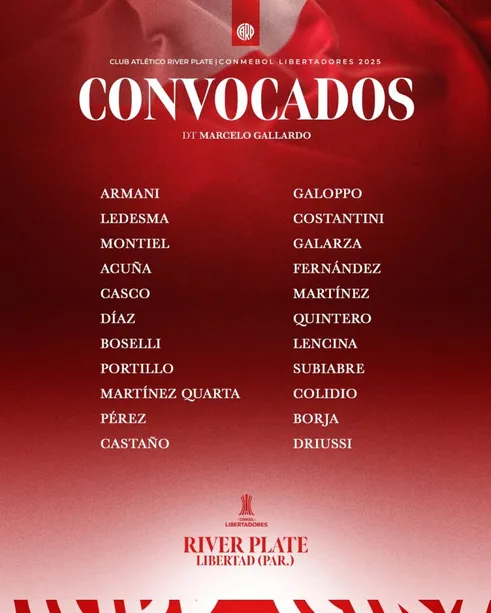 Este jueves, River se jugará la clasificación a los cuartos de final de la Copa Libertadores enfrentando a Libertad. Luego de la igualdad a cero en el partido de ida, el Millonario buscará hacerse fuerte en el Monumental para sellar el pase a la siguiente ronda en su casa. A falta de un día para el partido, Gallardo definió la lista de convocados.