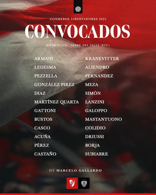 River tendrá la chance de asegurar su clasificación a los octavos de final de la Copa Libertadores 2025, este jueves cuando reciba a Independiente del Valle. Por eso será un partido clave el que se disputará en el Monumental, y Marcelo Gallardo confirmó la lista de convocados.