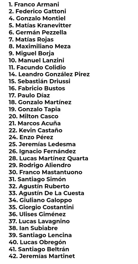 Luego de haber sufrido varias salidas durante el mercado de pases, hay nombres que ya no estarán en la lista: Franco Mastantuono (transferido al Real Madrid), Rodrigo Aliendro (a Vélez), Lucas Lavagnino (Independiente), Leandro González Pírez (Estudiantes) y Gonzalo Tapia (San Pablo).