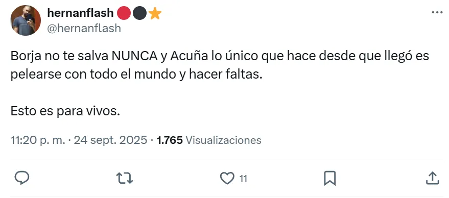 Pero sí los hinchas mostraron enojo por su característica reacción de pelearse. Representa cuando juega con pierna fuerte, garra y huevo, pero no cuando genera estos encontronazos innecesarios.