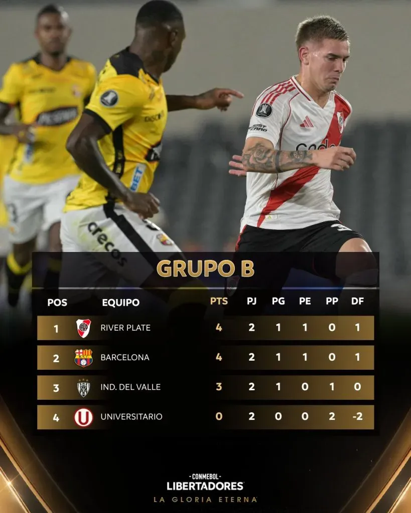 De esta forma, Independiente del Valle quedó ubicado en la tercera colocación de la zona con tres unidades y Universitario en el último lugar con cero puntos. En la próxima fecha, River jugará en Quito en la previa del superclásico mientras que Barcelona recibirá al elenco peruano.