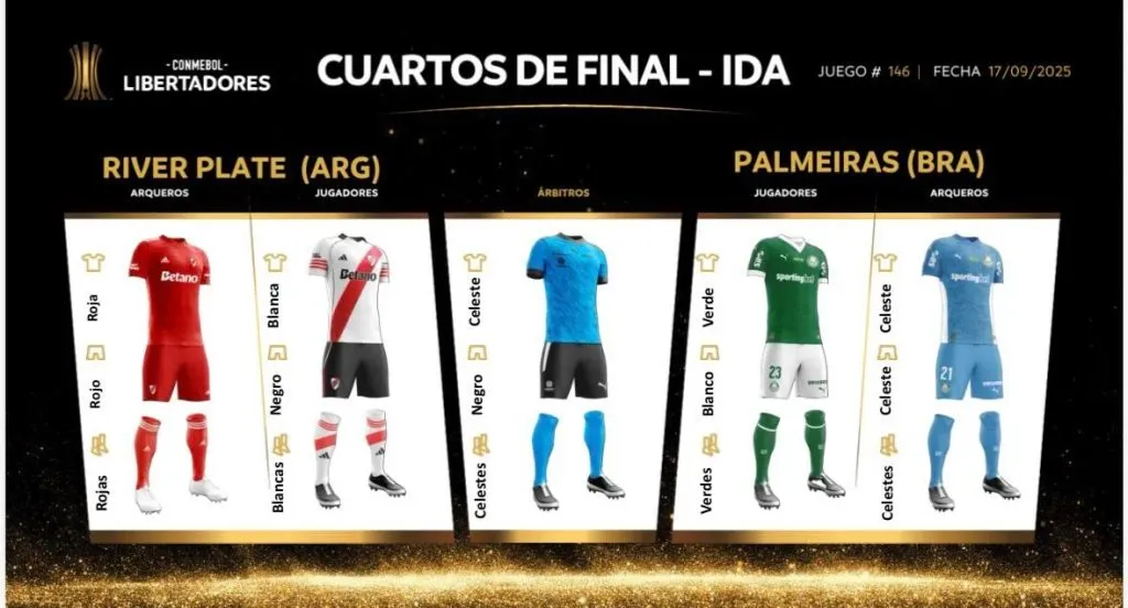 River y Palmeiras se enfrentan esta noche en el Monumental. Será en el duelo de ida de los cuartos de final de la Copa Libertadores, que tendrá al venezolano Jesús Valenzuela como árbitro. Y a falta de algunas horas para el comienzo del partido, ya se sabe qué camisetas usará cada equipo.