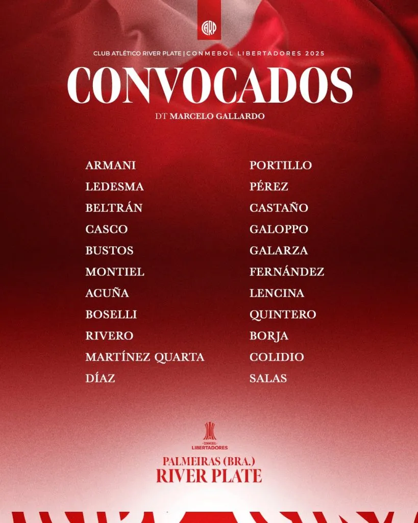 River enfrentará a Palmeiras este miércoles, desde las 21:30 horas, en el Allianz Parque, por la vuelta de los cuartos de final de la Copa Libertadores. Después del entrenamiento de la mañana, Marcelo Gallardo confirmó la lista de convocado que viajan a Brasil en busca de la épica para lograr el pase a las semifinales.