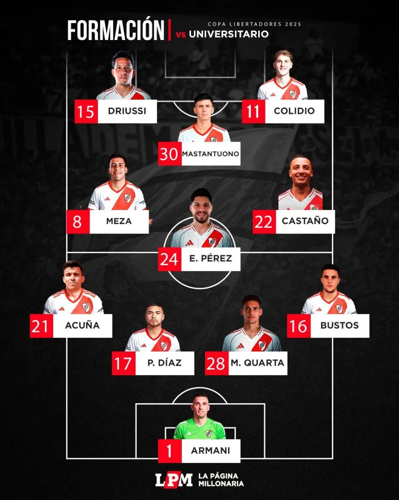 Gallardo ya tiene a los once para el debut: Franco Armani; Fabricio Bustos, Lucas Martínez Quarta, Paulo Díaz, Marcos Acuña; Kevin Castaño, Enzo Pérez; Maximiliano Meza, Franco Mastantuono; Sebastián Driussi y Facundo Colidio.