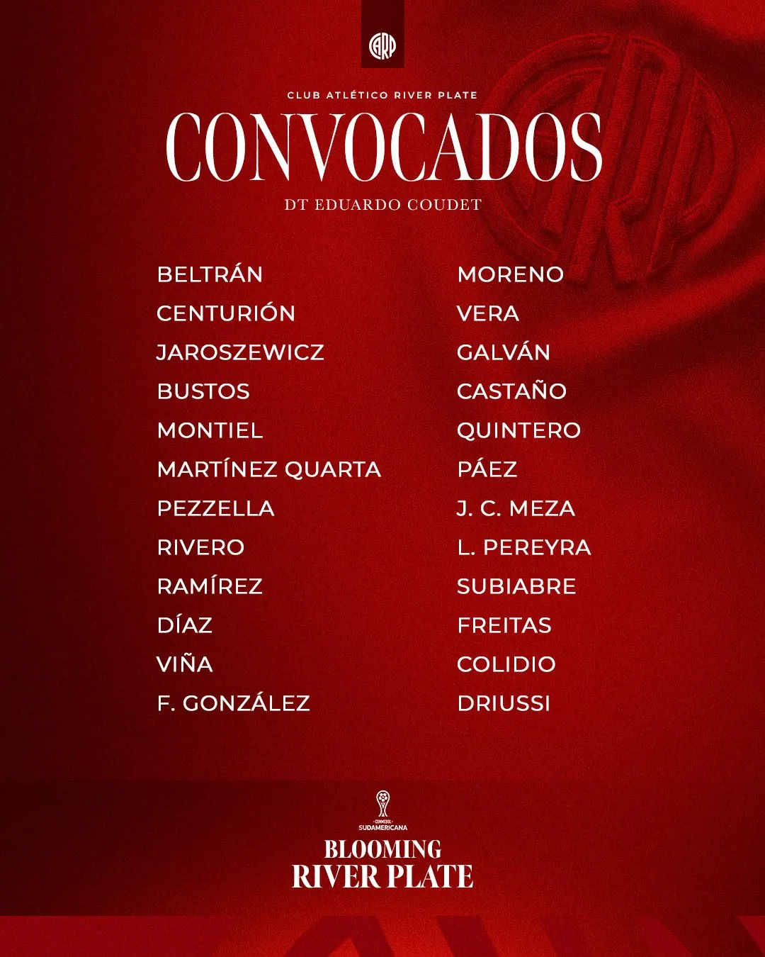 River afrontará este miércoles su primer examen en la Copa Sudamericana 2026. El Millonario visitará al Blooming de Bolivia por la primera fecha del Grupo H en el Estadio Ramón “Tahuichi” y Eduardo Coudet ya definió la lista de convocados para dicho encuentro.