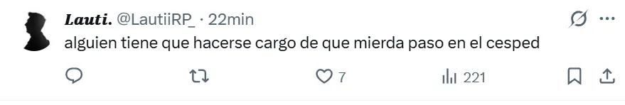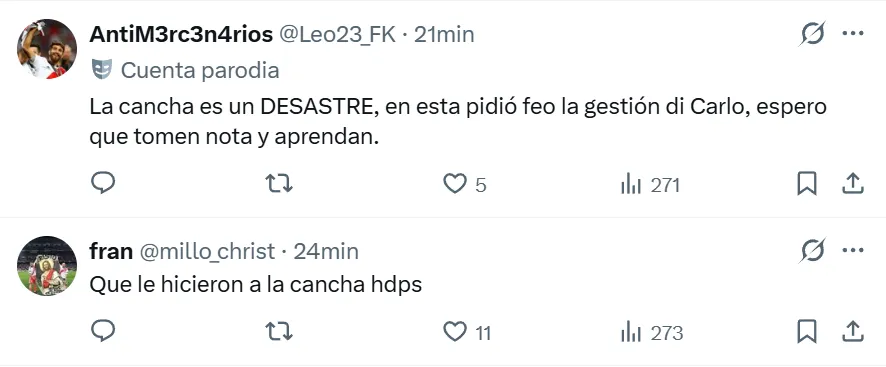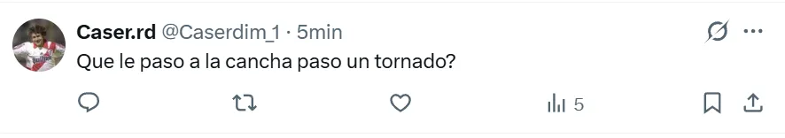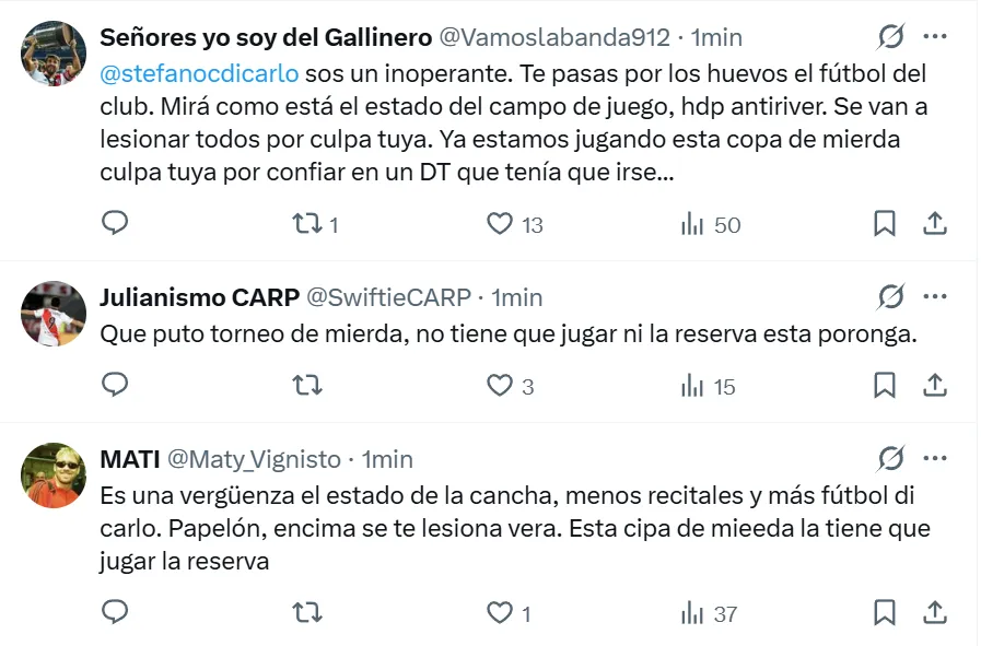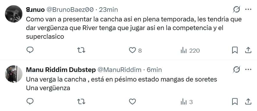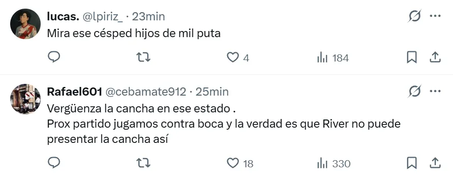 “No se puede jugar con este pasto”, reclamó Fausto Vera, tras salir lesionado, otro dolor de cabeza pensando en el partido del domingo contra Boca. Y los hinchas se expresaron en redes, todos muy enojados con el estado del Monumental, y preocupados. Es que parece difícil que llegue en buenas condiciones al Superclásico, y un mal campo de juego dificulta el estilo de juego de River.