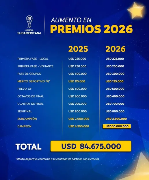 En relación a la edición 2025 de la Sudamericana, CONMEBOL estableció algunos aumentos: US$ 10.000 más por mérito deportivo, US$ 500.000 más por ser subcampeón y US$ 3.500.000 más por ser campeón. Los premios del resto de las instancias se mantienen igual.