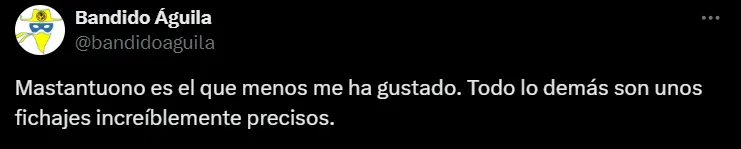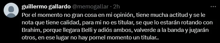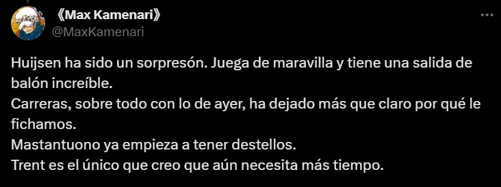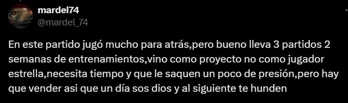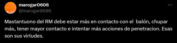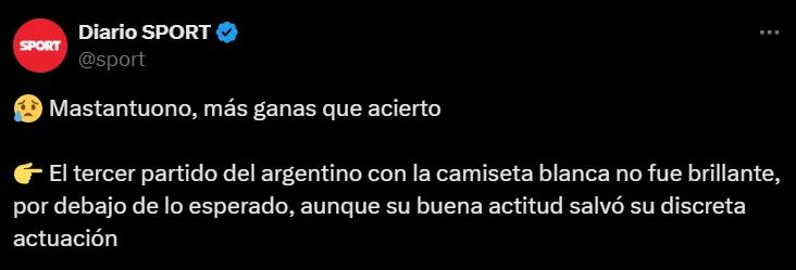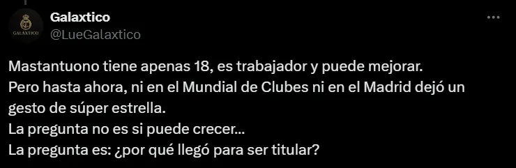 Después de su primer partido como titular en el Santiago Bernabéu, Mastantuono recibió algunas críticas en redes sociales por parte de los hinchas blancos. Si bien tuvo una chance clarísima y participó en uno de los goles del equipo, insisten en que aún no demuestra suficiente peso ofensivo.