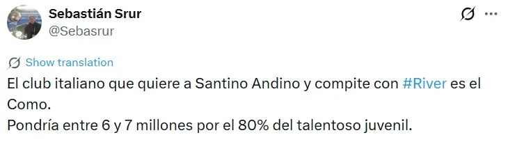 Para colmo, en las últimas horas surgió la información de que un club italiano se interesó en Andino e incluso realizó una oferta superior a la de River. Según consignó Sebastián Srur, el Como, que milita en la Serie A, estaría dispuesto a desembolsar entre seis y siete millones también por el 80% de su ficha. Asimismo, el mencionado periodista consignó que también hay un equipo brasileño que estaría dispuesto a superar la propuesta del Millo.
