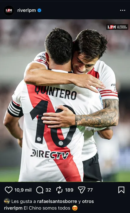 Mientras River se interesa en contar nuevamente con el colombiano, este último tuvo una interacción que genera ilusión. Tras la victoria ante Barracas Central, Santos Borré le dio ‘me gusta’ a una publicación de La Página Millonaria en Instagram en la que se los ve a Juanfer Quintero y Martínez Quarta festejando uno de los goles.
