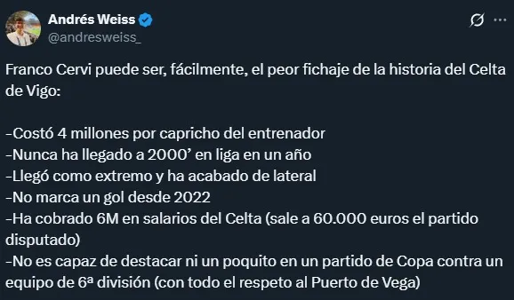 De hecho, en la temporada 2025/25, Cervi jugó solamente 11 veces. El ex Rosario Central lleva un largo tiempo inmerso en un complicado presente en España. Incluso ya hay quienes lo catalogan como uno de los “peores fichajes de la historia del Celta de Vigo” por lo que se pagó por él, por lo poco que destacó y sus escasos minutos en cancha.