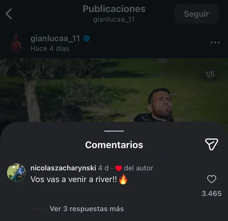 Mientras los rumores toman fuerza, el propio Gianluca se encargó de hacer un guiño en las redes sociales. Hace algunos días, el delantero compartió una serie de imágenes, una de ellas junto a Nicolás Otamendi, en su cuenta de Instagram. Los comentarios no tardaron en aparecer y cientos de hinchas le pidieron que vuelva a River. Precisamente, uno de ellos recibió la aprobación del jugador.