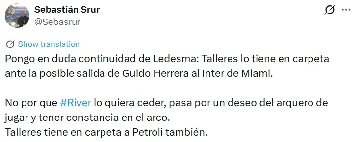 En este caso, el periodista consignó que River no busca ceder al futbolista, sino que es el propio Ledesma quien desea jugar y “tener constancia en el arco”. Asimismo, agregó que, en caso de no poder acordar con River, la segunda opción es Lucas Petroli, ex futbolista del Millonario quien milita en Godoy Cruz.