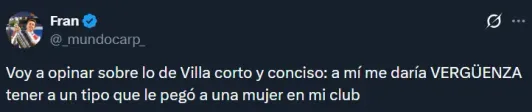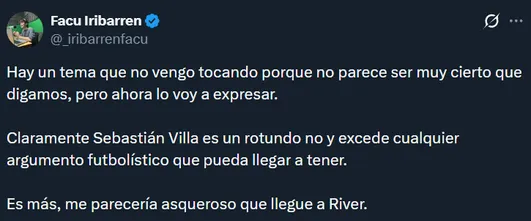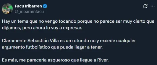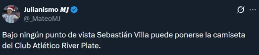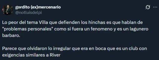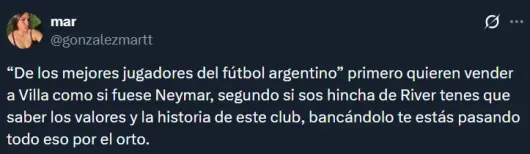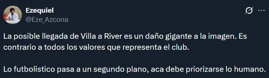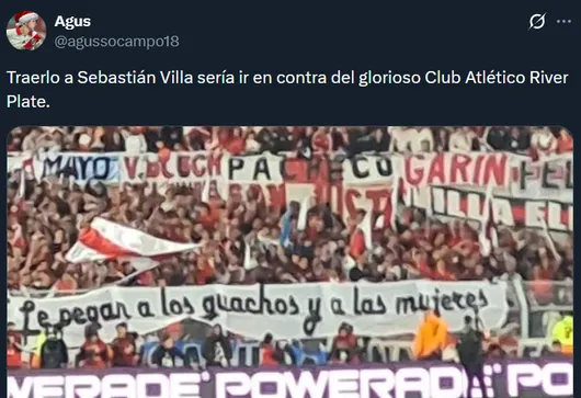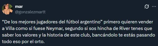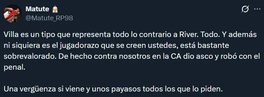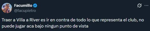 El rumor empezó en Mendoza, desde donde se empezó a hablar en torno a la posibilidad de que el delantero llegue a Núñez. Como era de esperar, esta versión no tardó en resonar y dar de qué hablar entre los riverplatenses, sobre todo por el pasado de Villa en Boca y las cuestiones extrafutbolísticas que lo rodean.