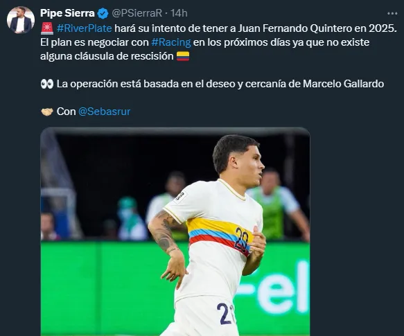 En las últimas horas, el periodista Pipe Sierra, especializado en el mercado de pases colombiano, confirmó que River tiene planificado comenzar a negociar con Racing por Juanfer en las próximas semanas. “River hará su intento de tener a Juan Fernando Quintero en 2025”, informó en sus redes, agregando que el contrato del Nalgón con la Academia no posee cláusula de rescisión.