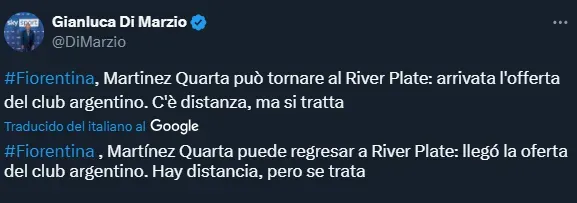 Según informó Gianluca Di Marzio, periodista especializado en el mercado de pases italiano, el Millonario ya presentó una oferta formal para comprar la ficha y los clubes están en negociaciones avanzadas: “Actualmente existe una diferencia entre la oferta de River y lo que pretende Fiorentina, pero las partes están trabajando y existen las condiciones para cerrar el acuerdo“, indicó el comunicador.