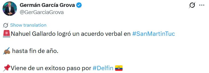 La carrera de Nahuel Gallardo sumará un nuevo capítulo en 2026. Tras desempeñarse durante un año en Delfín de Ecuador, el hijo mayor del Muñeco llegó a un acuerdo verbal para fichar por San Martín de Tucumán y jugar en la Segunda División del fútbol argentino.