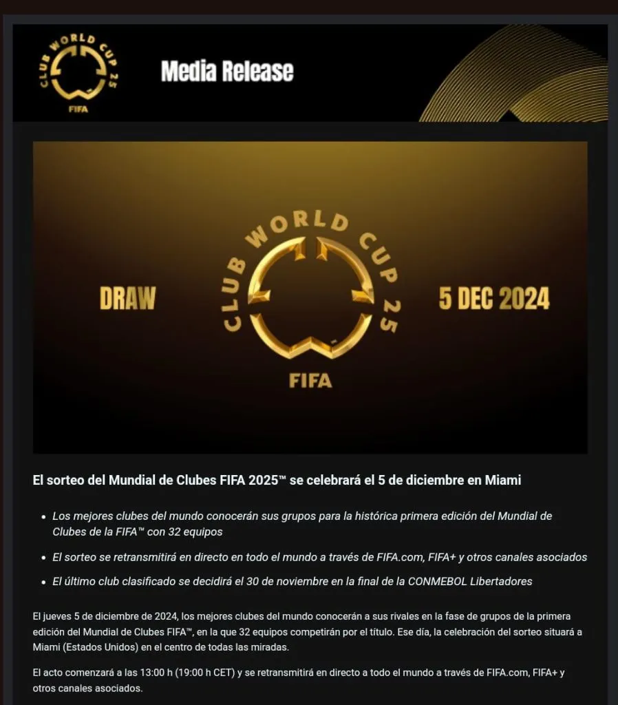 El jueves 5 de diciembre fue la fecha elegida para el sorteo, que será transmitido desde las 15.00 (hora Argentina) en todo el mundo desde la ciudad de Miami. Ese día, River va a conocer a los integrantes de su grupo en el certamen de clubes que comenzará el 15 de junio y cuyo partido inaugural se va a disputar en el Estadio Hard Rock de Miami. La final está pautada para el 13 de julio.