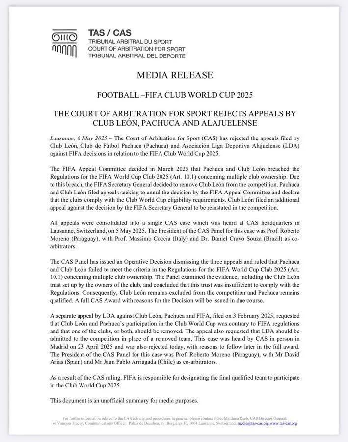 Después de conocerse esta medida, León acudió al TAS para intentar que se revea la decisión y comenzó una campaña con sus hinchas. Lamentablemente para ellos, el Tribunal confirmó el fallo y finalmente oficializaron que fueron eliminados. Allí también señalaron que la FIFA deberá elegir al reemplazo.