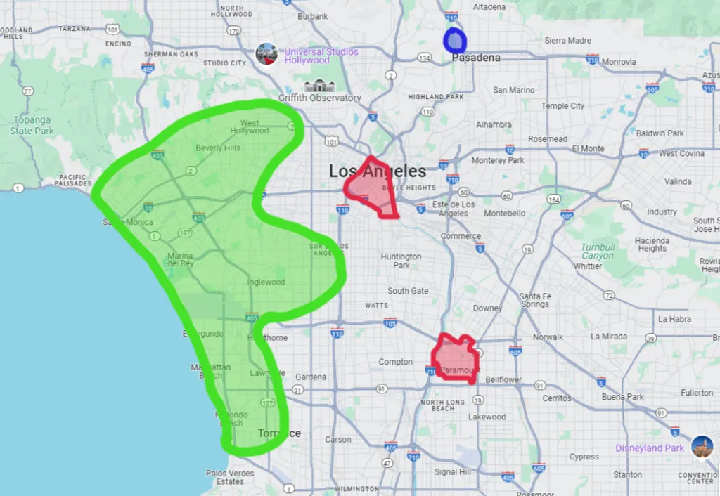 En rojo: las zonas del conflicto. En verde: la zonas turística (y donde la mayoría de los hinchas se alojará). En azul: el Rose Bowl Stadium.