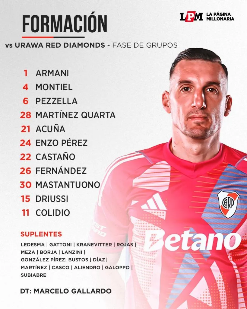 Los once jugadores elegidos por Gallardo para el debut: Franco Armani; Gonzalo Montiel, Germán Pezzella, Lucas Martínez Quarta, Marcos Acuña; Enzo Pérez, Kevin Castaño, Nacho Fernández; Franco Mastantuono; Facundo Colidio y Sebastián Driussi.