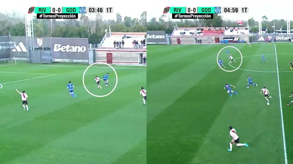 También suele posicionarse desde zonas exteriores, más cerca de la línea de cal y desbordando por el sector izquierdo. Esto se pudo ver frecuentemente en el partido frente a Independiente, ya que constantemente él era la opción para salir del bloque rival y conducir con espacios.