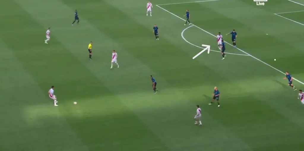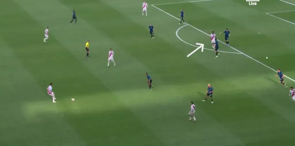 Seguimos con sus acciones cuando el equipo no tiene la pelota: pocas veces lo vemos ejerciendo presión y actuando como primer defensor.