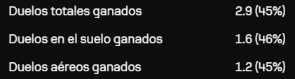 Otro detalle para cerrar con su actividad sin pelota que es que no suele ganar la mayoría de sus duelos aéreos ni terrestres, raro teniendo en cuenta su contextura física. No es un futbolista que se imponga físicamente para sacar provecho de cada jugada que pasa por él.