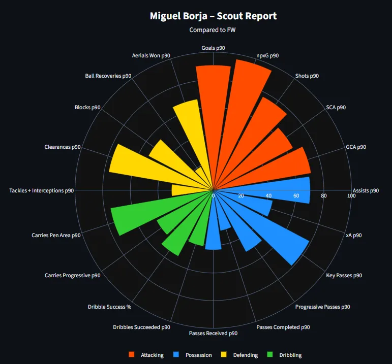 Hay dos aspectos positivos para marcar. El primero es que solía ser bastante productivo en cuanto a goles. No es un delantero que tenga variedad de ángulos porque, como dije antes, no es para nada versátil, pero si lograba ser consistente en contribuciones a lo largo de los partidos.