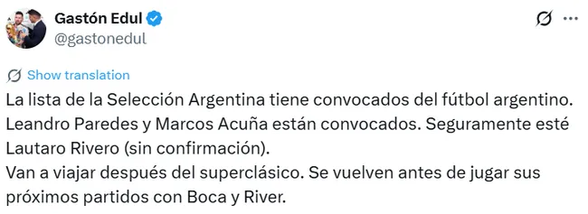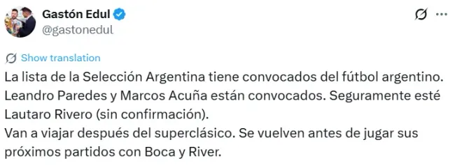 Según informó el periodista Gastón Edul, tanto Marcos Acuña como Lautaro Rivero serían convocados para viajar al país africano en el marco de la fecha FIFA de este mes. La buena noticia es que, en principio, ambos regresarían para estar disponibles para el partido de la última fecha contra Vélez en el Estadio José Amalfitani, que se jugará el fin de semana del 16 de noviembre sin fecha ni horario confirmado, por lo que no se perderían ningún partido con el Millonario.