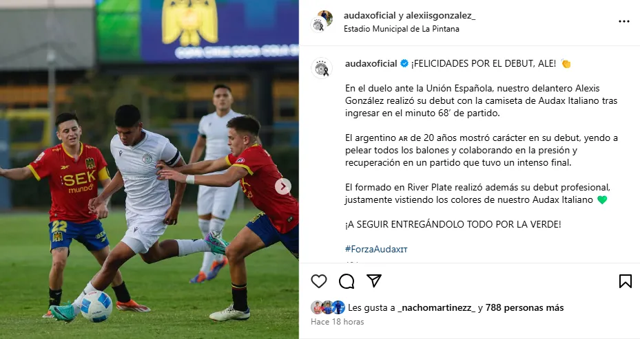 “Solo dar gracias a Dios por este gran paso, a seguir sumando y mejorando siempre. También agradecido a Audax Itailano por la oportunidad!!“, escribió el centrodelantero de 20 años, que estará en el equipo chileno hasta el 31 de diciembre del presente año con una opción de compra cuyo monto no trascendió.