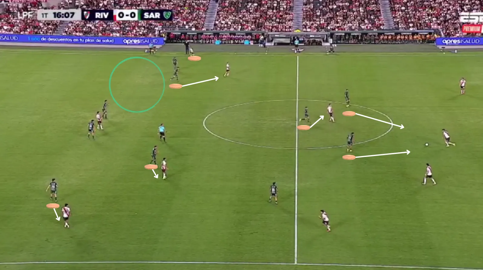En el Monumental, frente a bloques bajos como el de Sarmiento, el equipo logró sostener altos niveles de posesión y, a diferencia de etapas anteriores, encontró mejores soluciones para atacar defensas cerradas. Ya no se trata de acumular centros sin sentido, sino de construir jugadas con criterio.