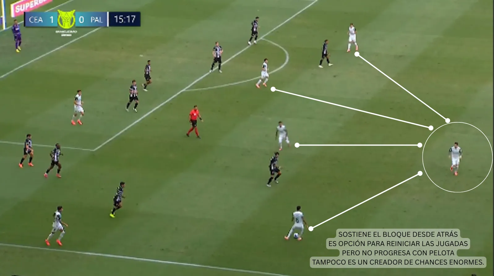 Una forma de construir con él es que sea el primer receptor de los centrales, como hacía en Palmeiras. Baja a la línea defensiva, atrae presiones y suelta para progresar con ventaja.