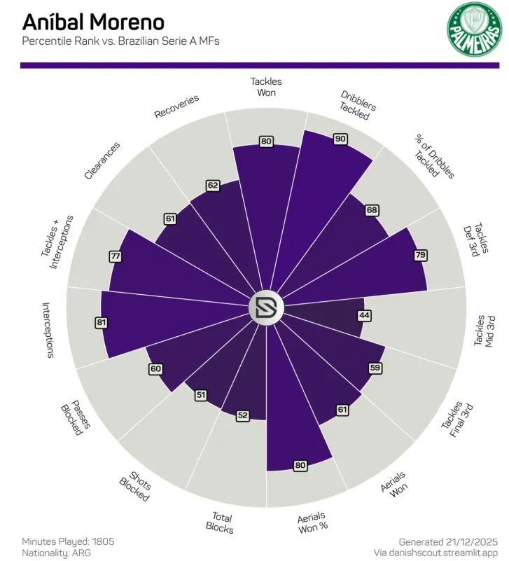 Moreno es un pivote organizador de corte defensivo. Destaca en pases largos completados, en desafíos defensivos y en intercepciones. Su bajo volumen de pases progresivos y acciones de creación confirma su rol: ordenar, equilibrar y sostener. Tiene aspectos a corregir, como recibir dentro del bloque o cubrir espacios ajenos, pero son ajustes tácticos. A priori encaja perfecto; la clave será su rol exacto en el sistema de River Plate de Marcelo Gallardo.