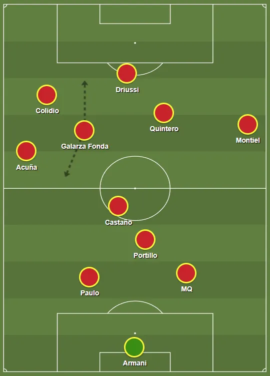 La otra opción –y la que menos se adapta a sus cualidades– es que tome el rol de organizador por izquierda, siendo dueño de la circulación y que tenga una alta tasa de toques. Según los dos esquemas utilizados regularmente por Gallardo: