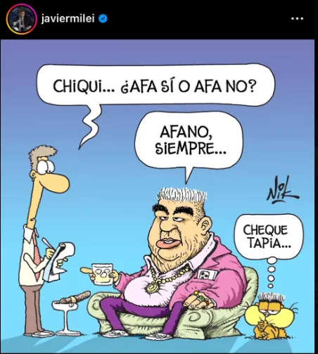 Un rumor que cobró fuerza luego de un posteo del presidente argentino en donde compartió una caricatura de Nik en la cual se puede ver a Chiqui Tapia declarando “Afano Siempre” ante una pregunta de un periodista. En la misma, Gaturro llama “Cheque Tapia” al presidente de la AFA.
