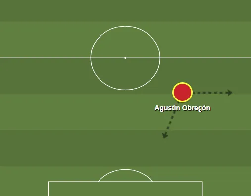 Algo que vale la pena destacar antes de iniciar es que nos llama mucho la atención, e incluso puede tomarse como su mayor virtud, lo bien que se desenvuelve Obregón a la hora de dar apoyos profundos al mediocampo. No suelen ser determinantes, pero sí útiles para crear paredes, progresar colectivamente y facilitar la construcción con ventaja numérica desde el fondo.